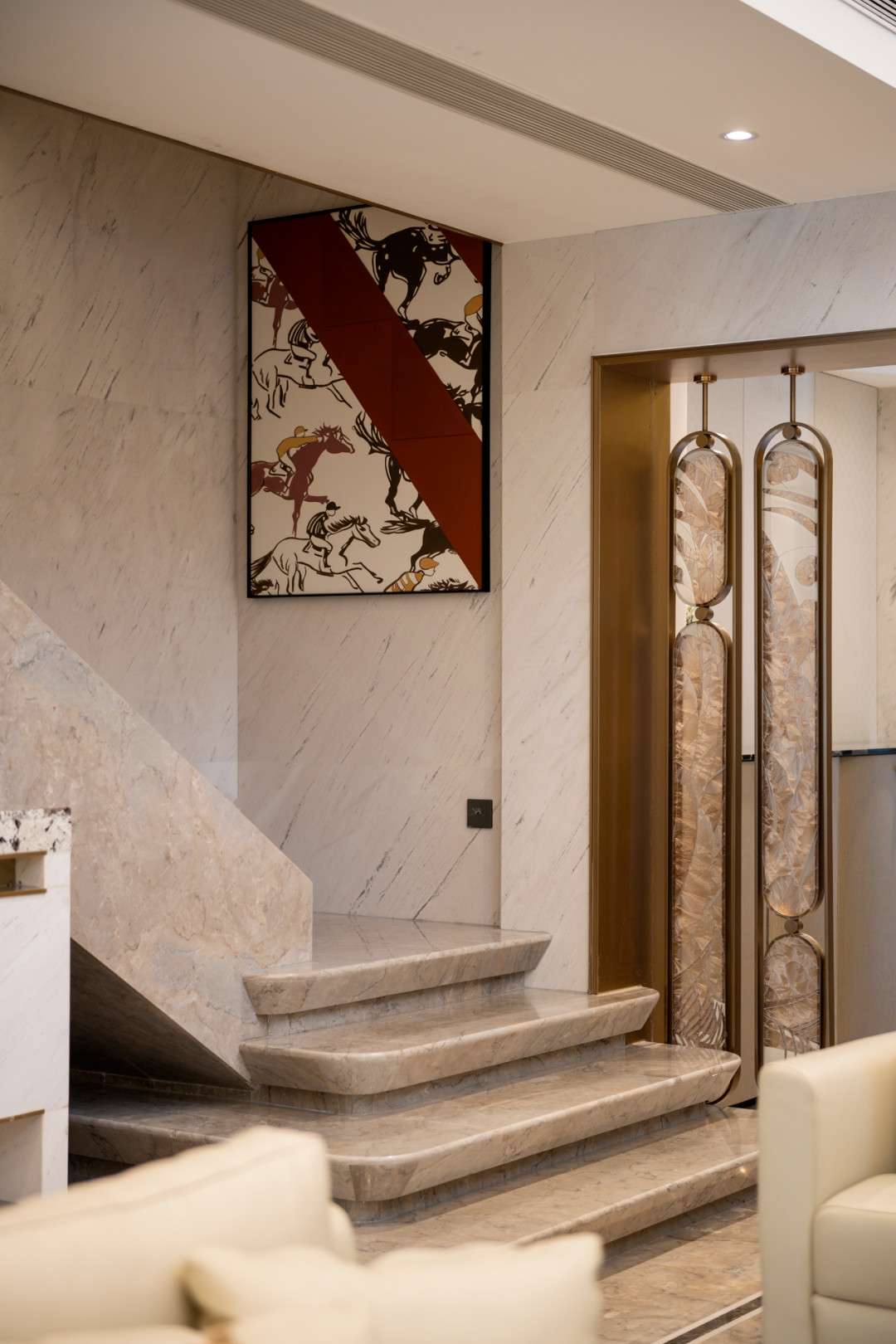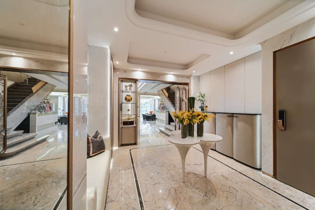 Sảnh vào được thiết kế thanh thoát nhưng vẫn đầy ấn tượng, mở ra một thế giới nội thất cuốn hút. Nối liền với phòng khách, khu vực này tạo cảm giác chào đón ngay từ ánh nhìn đầu tiên. Hệ tủ hai bên không chỉ đóng vai trò vách ngăn tinh tế mà còn duy trì sự riêng tư, đồng thời đảm bảo độ thoáng đãng cho toàn bộ không gian.