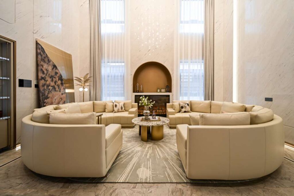 Thiết kế phòng khách nửa bao quanh phá vỡ những khuôn khổ truyền thống, khơi gợi sự sáng tạo trong không gian sống. Những đường nét đối xứng tạo cảm giác vững chãi, bề thế, trong khi các đường cong mềm mại giúp cân bằng tổng thể, mang đến sự thư thái và dễ chịu.