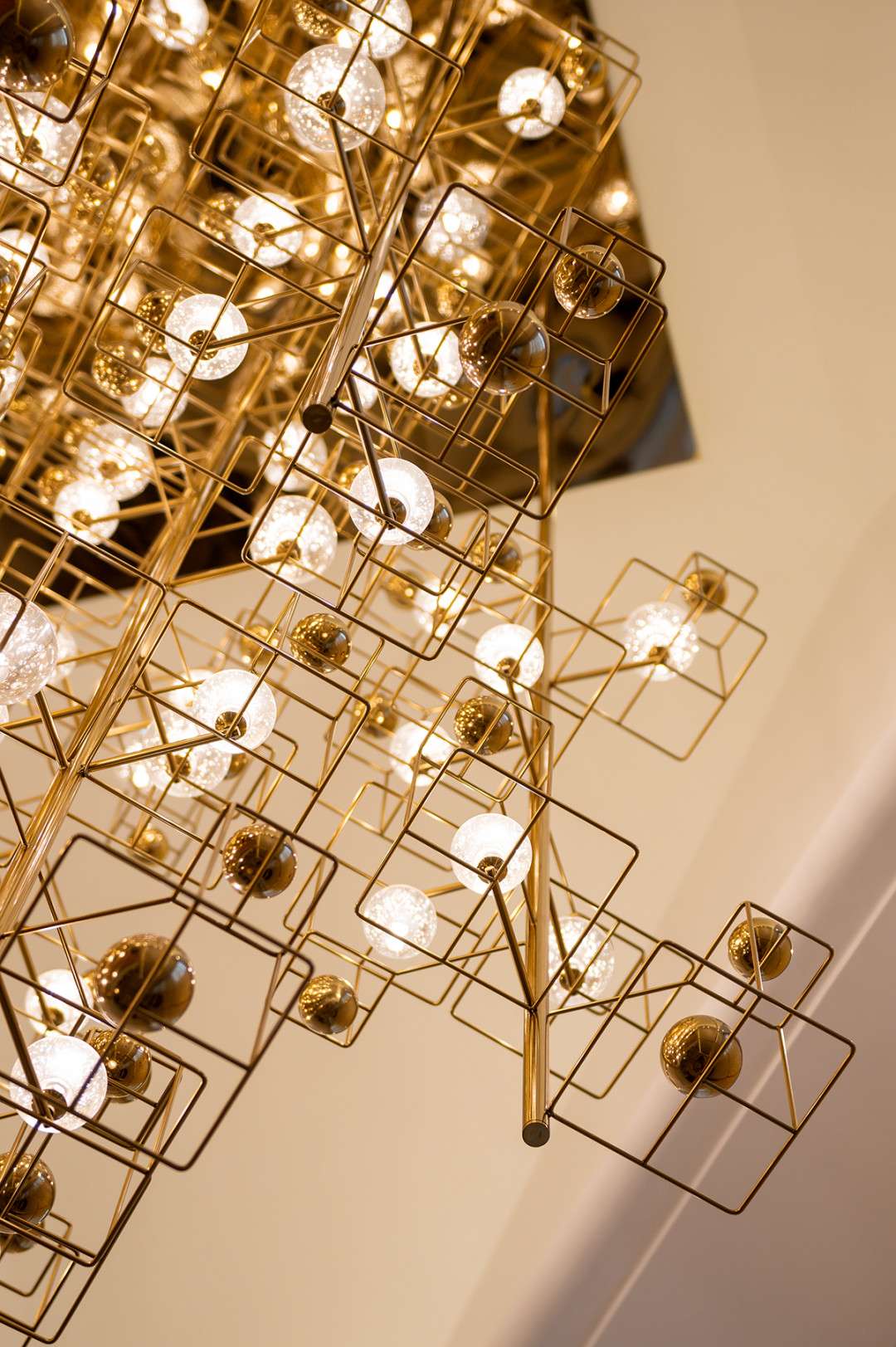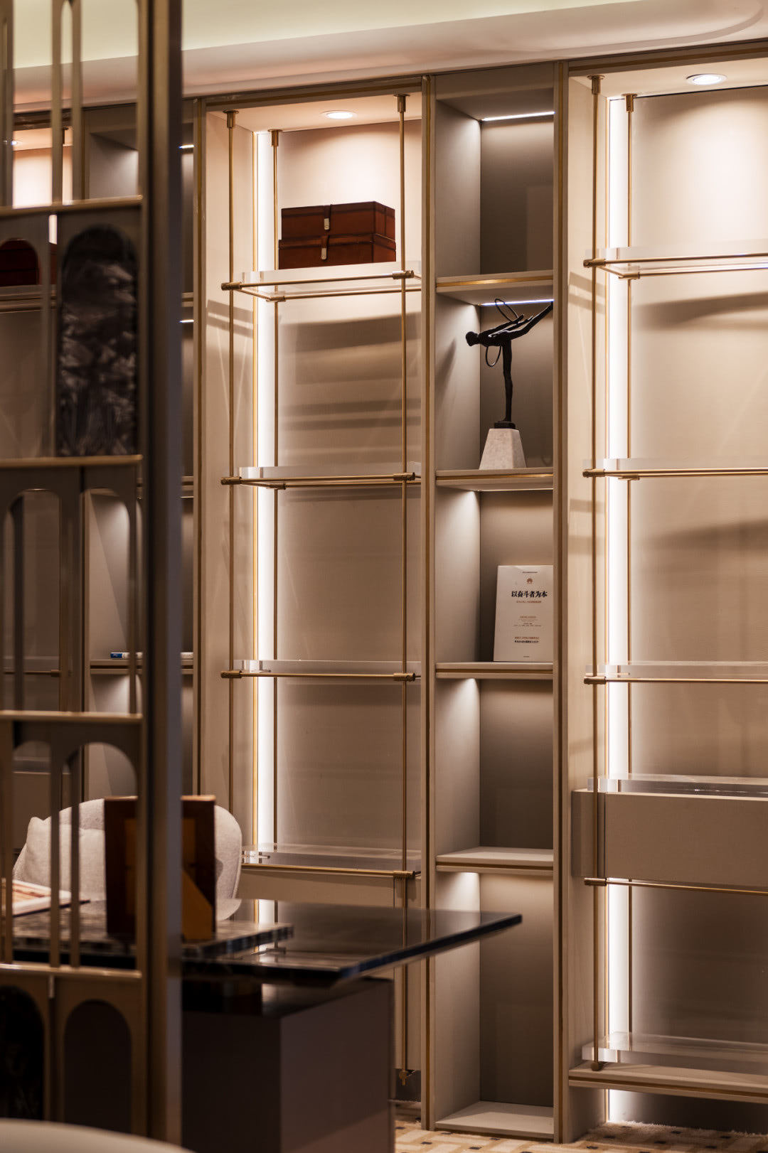 Ánh sáng vàng kim từ các chi tiết đèn kim loại càng làm nổi bật chủ đề, truyền tải sự quý phái và tinh thần sống thanh tao.