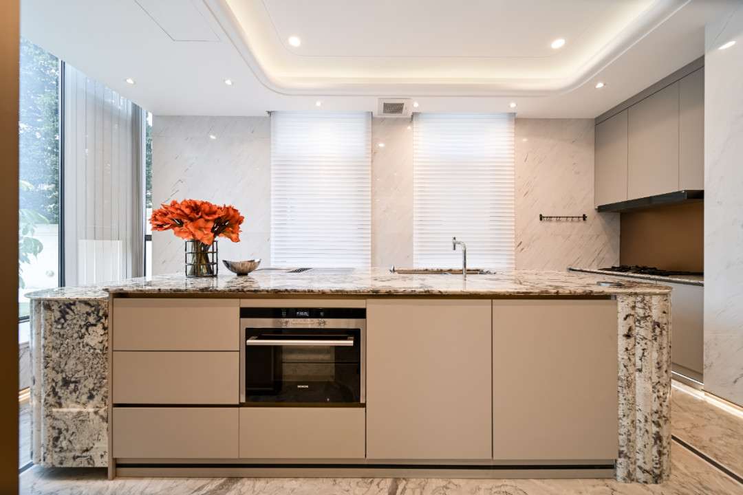 Không gian bếp mở giúp tối ưu sự tiện lợi trong quá trình nấu nướng, đồng thời duy trì vẻ đẹp tinh tế của tổng thể. Bề mặt kim loại ánh bạc và đá marble lạnh tạo hiệu ứng thị giác thanh lịch, hạn chế cảm giác oi bức, mang đến sự cân bằng hoàn hảo giữa thẩm mỹ và công năng.