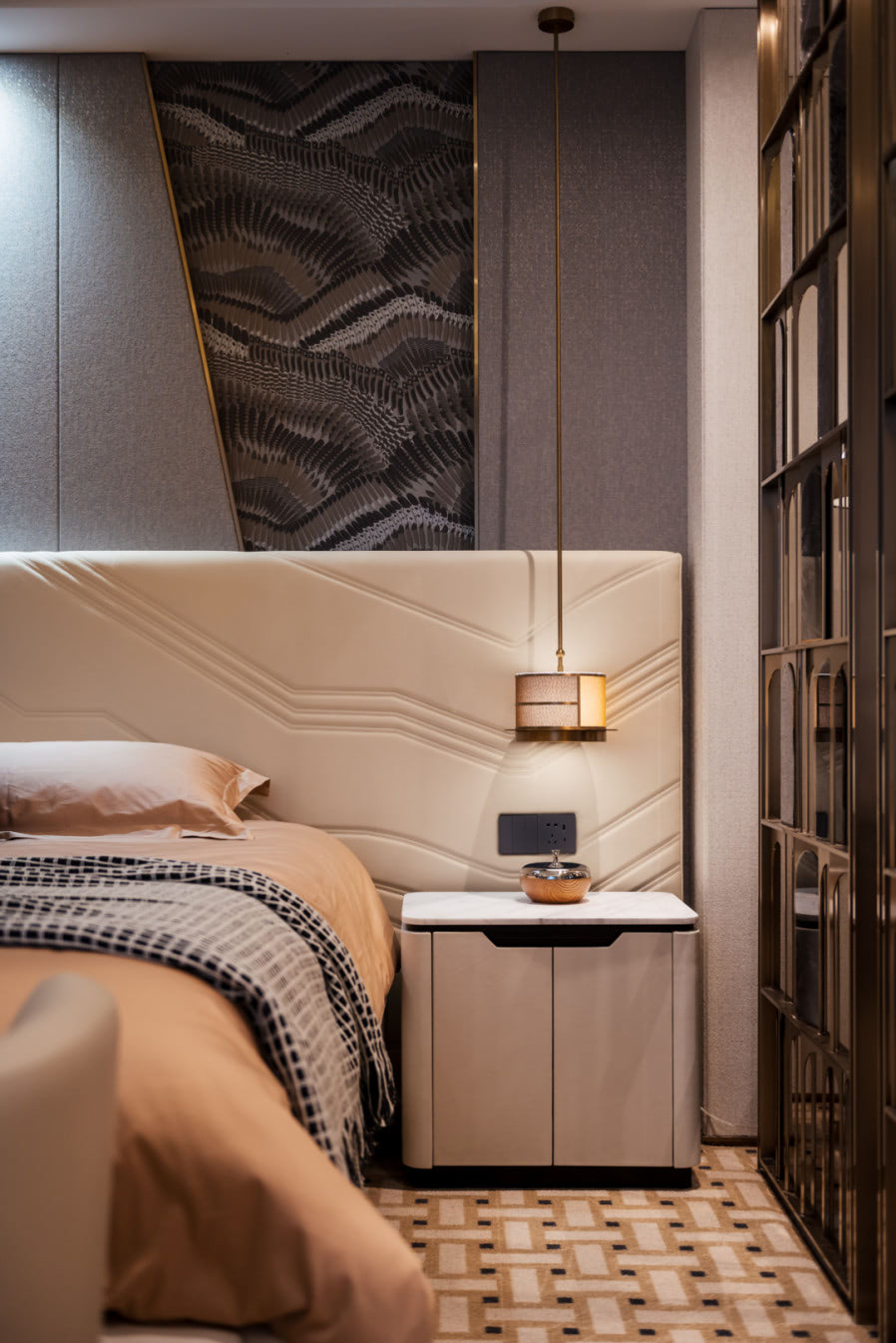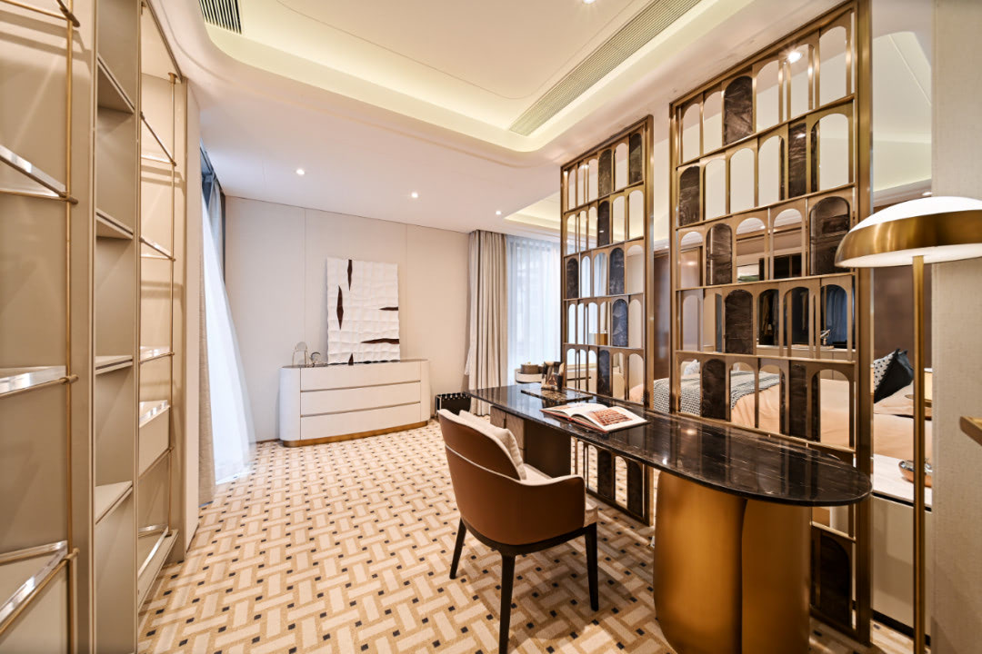Thảm caro với họa tiết tinh xảo mang nét cổ điển, tạo chiều sâu cho căn phòng. Các khu vực chức năng như phòng thay đồ hay thư phòng được bố trí liền kề, đảm bảo sự yên tĩnh, như đang lặng lẽ bảo vệ giấc ngủ và những khoảnh khắc nghỉ ngơi của gia chủ.