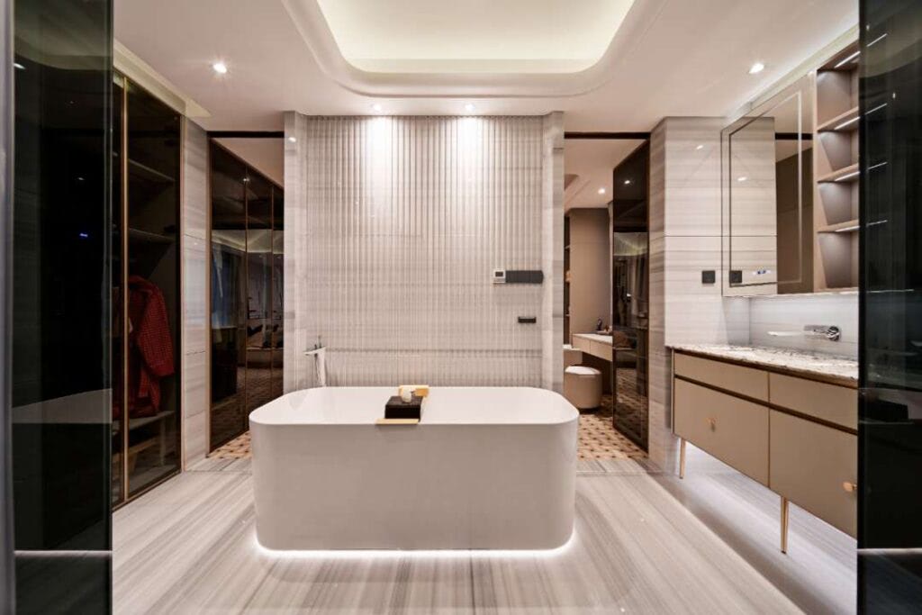Bồn tắm đặt khéo léo sau vách ngăn, vừa đảm bảo sự riêng tư vừa trở thành điểm nhấn thẩm mỹ, tôn lên vẻ đẹp nghệ thuật của không gian nghỉ ngơi.