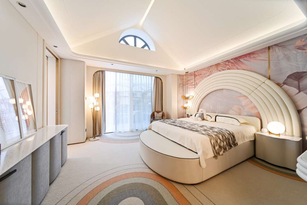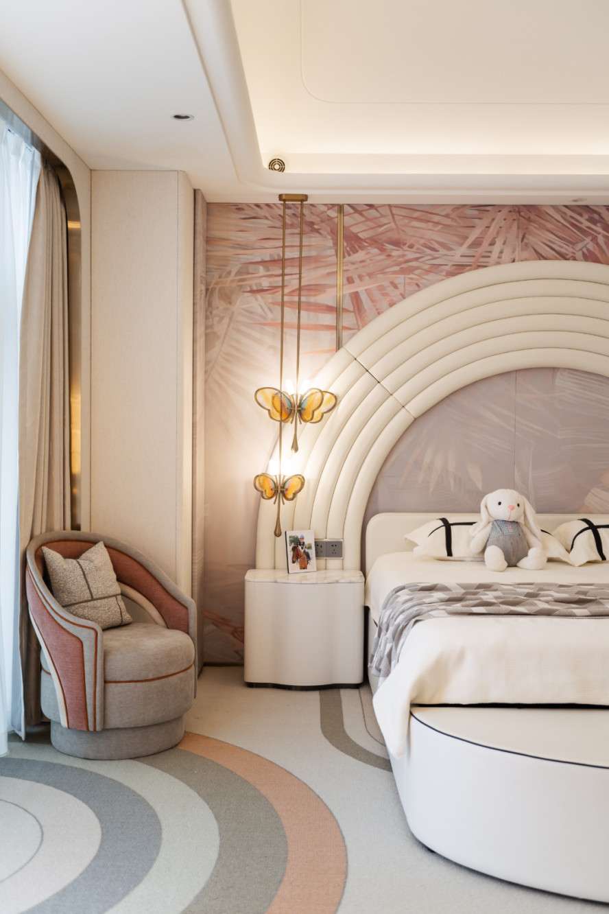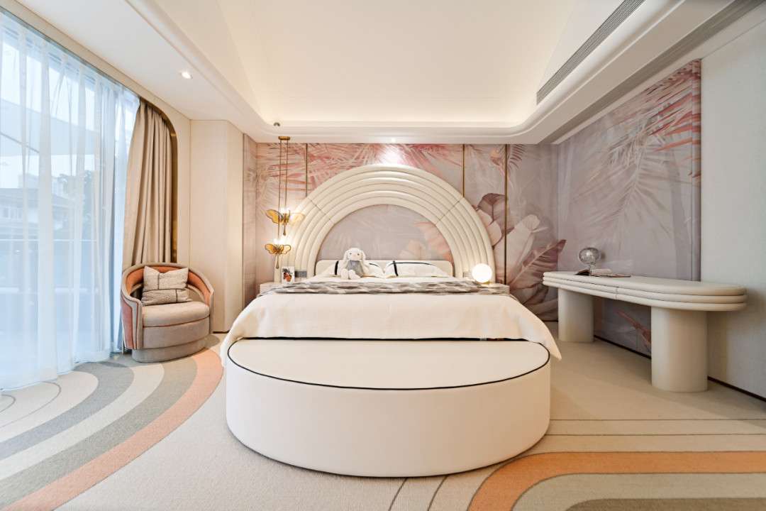 Những đường cong xuất hiện xuyên suốt – từ trần, tường đến nội thất – tạo nên sự mềm mại, nâng niu tâm hồn trẻ thơ. Dù tinh giản, nhưng mọi chi tiết đều được tính toán kỹ lưỡng, đảm bảo tính thẩm mỹ và tiện ích cho quá trình phát triển của bé.
